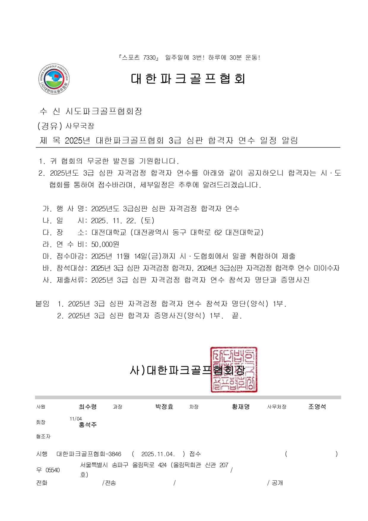 2025년 대한파크골프협회 3급 심판 합격자 연수 일정 알림