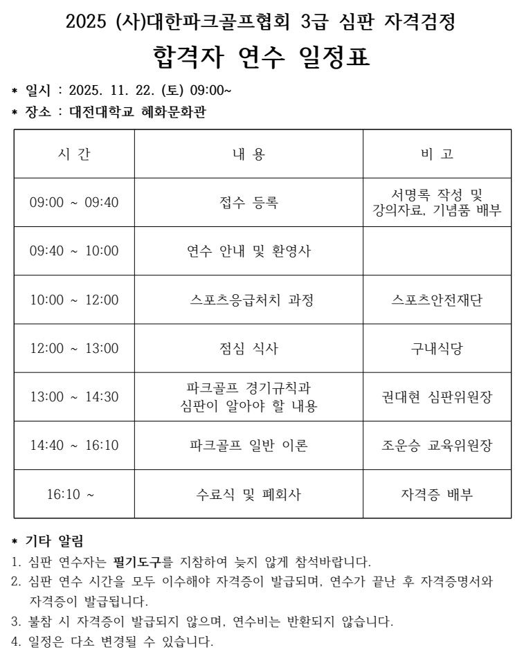 2025년 3급 심판 자격검정 합격자 연수 세부일정표